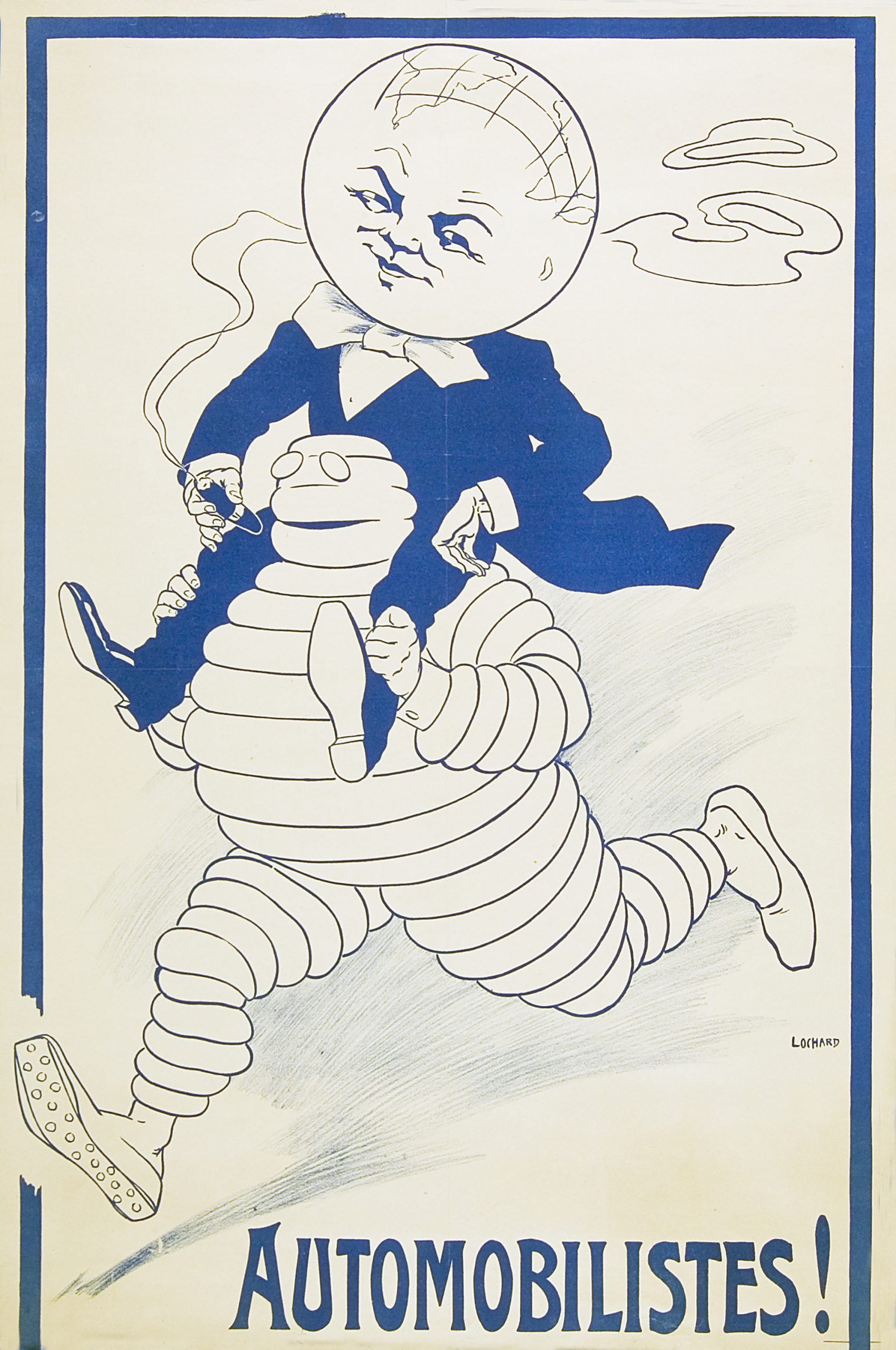 Lochard’s poster shows the moon, personified as a gentleman with a moon as a head in full evening dress (tails) smoking a cigar, riding on the shoulders of Bibendum (the mascot of Michelin tyres). The image suggests that the motoring world of well to do men is being transported by Michelin tyres.