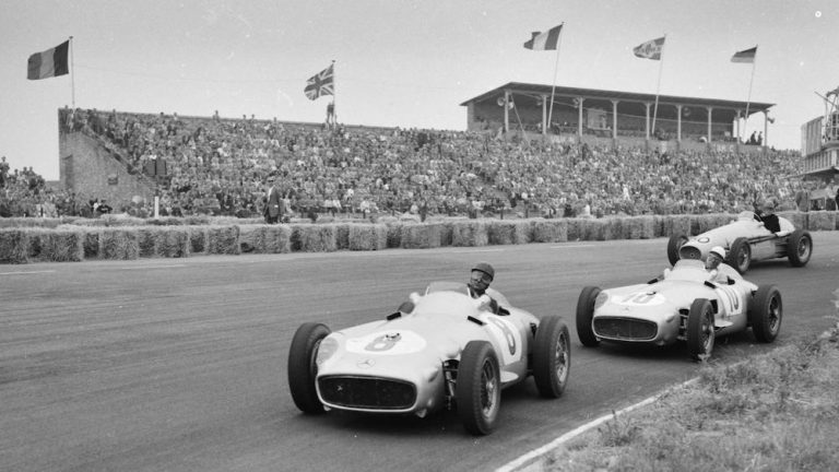 In 1954 Mercedes-Benz decided to return to the highest class of motor racing. Their Formula 1 car was technically highly advanced. The engine used desmodromic valve gear (without valve springs) which was unique, and the location of the large drum brakes inside the bodywork instead of in the wheels, was also a first for Formula 1. Furthermore, Mercedes-Benz hired the former Argentine world champion, Juan Manuel Fangio. This soon proved to be an unbeatable combination, resulting in Fangio’s second world title in 1954. The following year, 1955, was a repeat performance, this time supported by his British team-mate, Stirling Moss. Mercedes-Benz withdrew from motor sport at the end of 1955. Fangio won the race at Zandvoort closely followed by Stirling Moss.