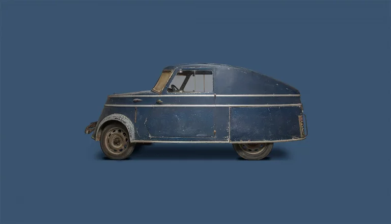 The electrically powered VLV (Voiture Légère de Ville – light town car) was manufactured by Peugeot during World War II because of the lack of fossil fuels. It has the appearance of a three-wheeler, but the two rear wheels are placed very close together – the track width is no more than 33.5 cm.