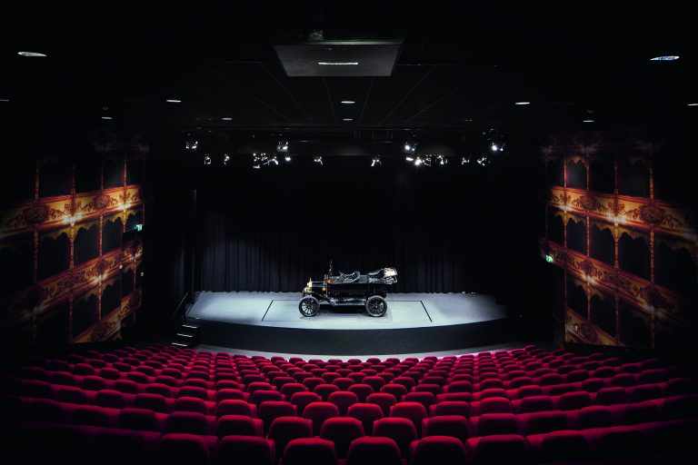 De inrichting van het theater van het Louwman Museum is gebaseerd op het ‘Teatro Grande’ in Brescia, de stad waar jaarlijks de Mille Miglia start. In het podium kan een auto worden gepresenteerd met behulp van een speciale lift.