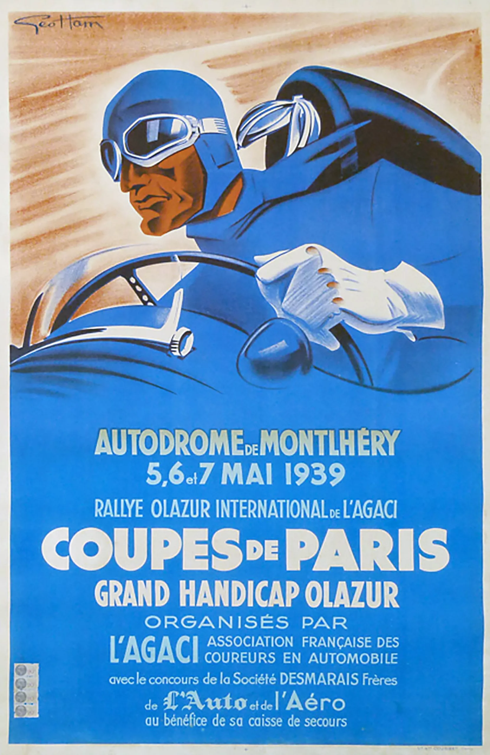 De Grand Prix Automobile de Paris or Coupe de Paris was één van de meest prestigieuze autorace evenementen in Frankrijk. De eerste race was in 1939 en werd gehouden bij de Autodrome de Linas – Montlhéry in Essonne en in de Bois de Boulogne vlakbij Parijs. Van 1939 tot 1949 was de race onderdeel van het Grand Prix seizoen. Ham’s toepassing van een dominante kleur blauw en strakke eenvoudige lijnen springt in het oog en activeert onze wedstrijdverbeelding en het idee van snelheid.